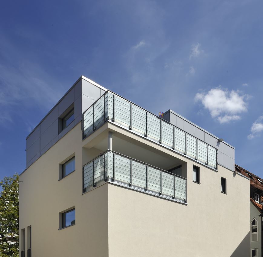 Der Neubau in Massivbauweise passt sich harmonisch in sein Umfeld ein und gibt dem davor liegenden Platz einen neuen Rahmen. Die in den beiden oberen Geschossen liegenden Wohnungen überzeugen mit hellen Räumen und großen Terrassen.